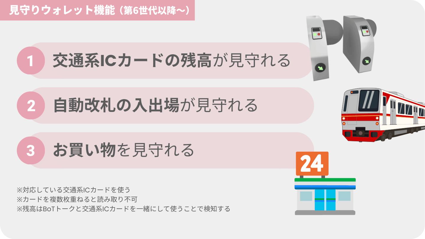 第6世代BoTトークは、アプリで交通系ICカードの残高が見守れるほか、自動改札の入出場まで把握できる見守りウォレット機能付きです。