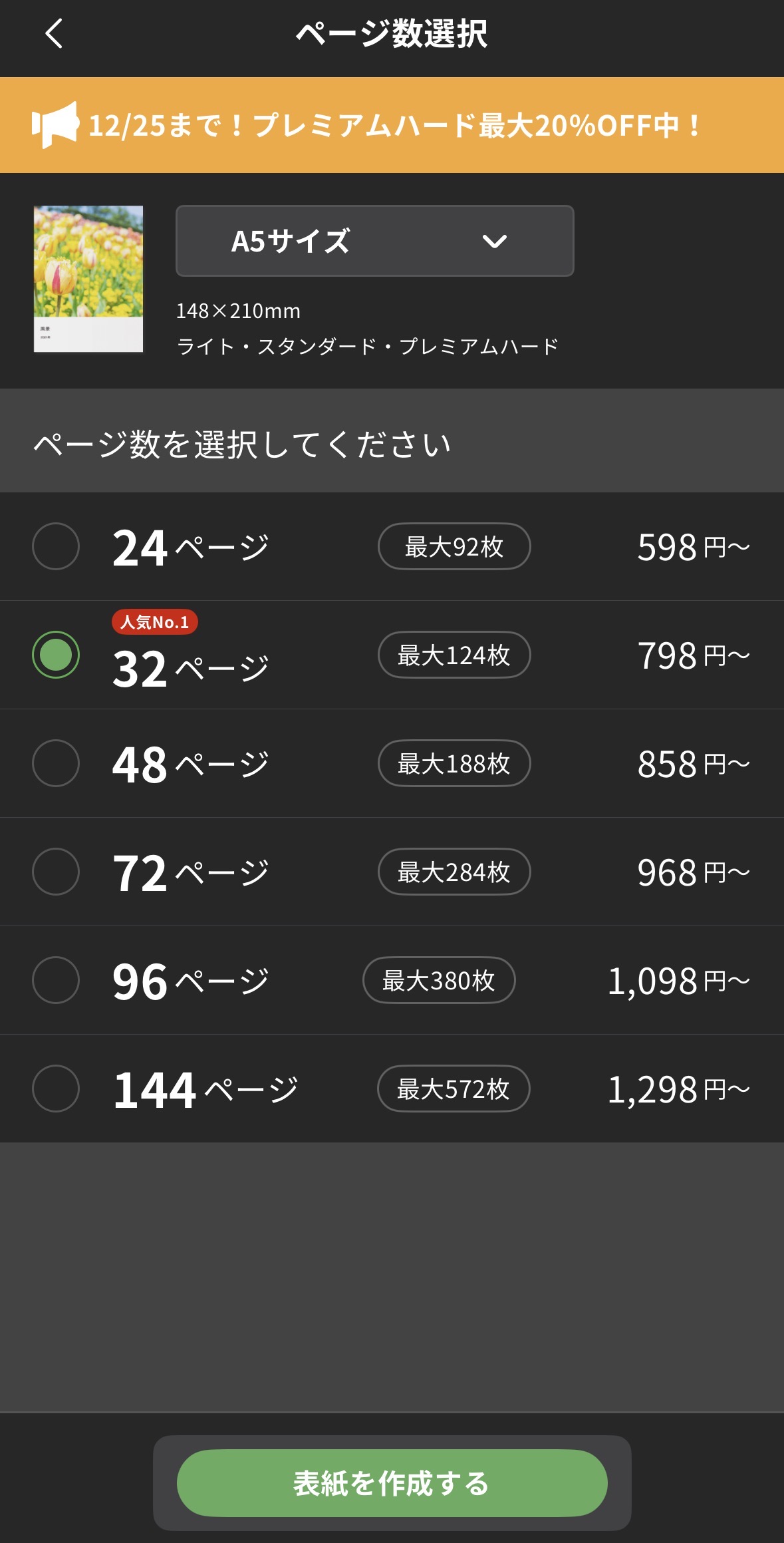 しまうまプリントのフォトブックのページ数は、24~144ページから選べます。